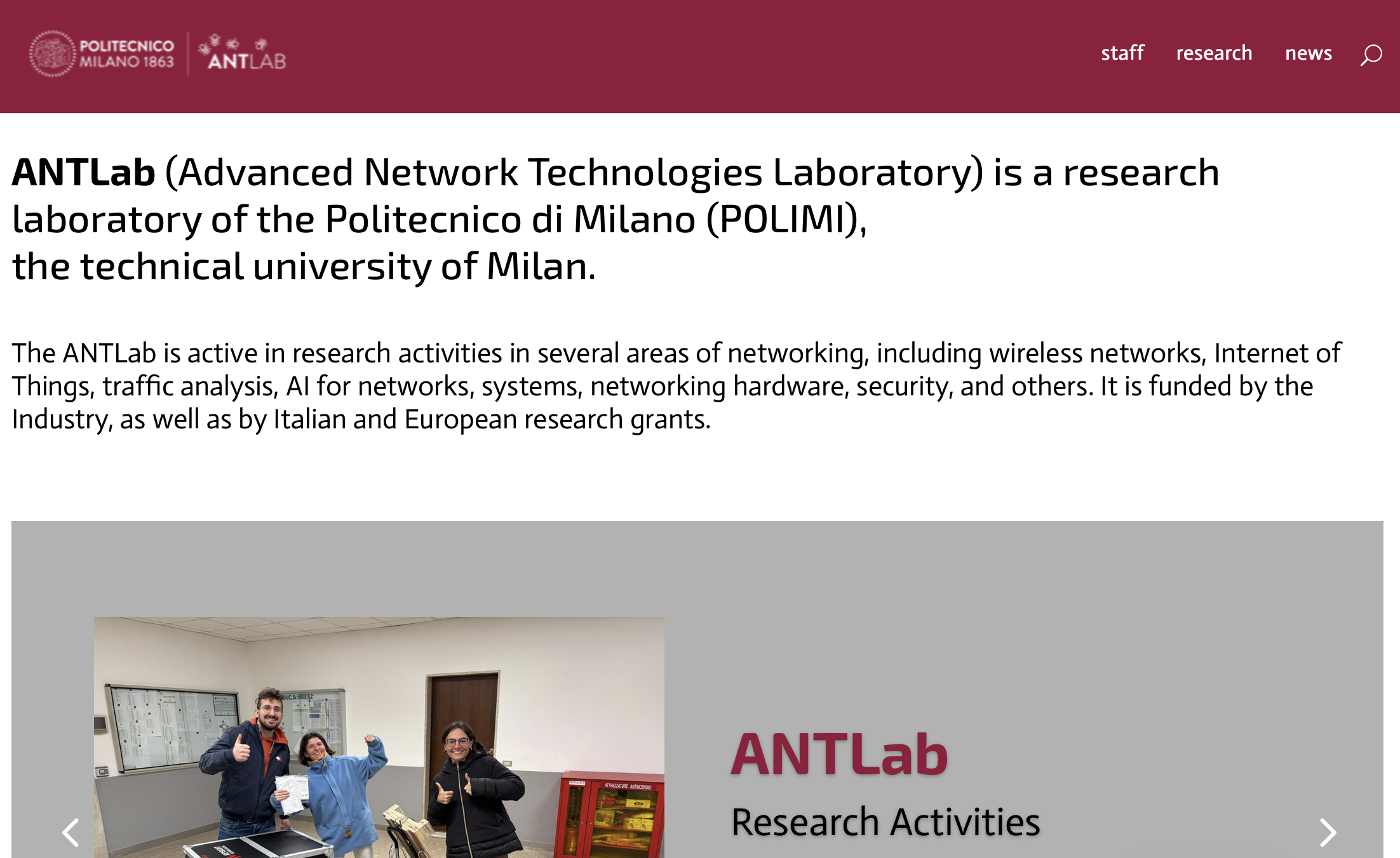 This INW2024 was great! ANTLab young researchers p Our group just presented two papers at the ACM CoN October of conferences for ANTLab! 1. @andreapimpi Few weeks ago, our PhD student Paolo Fiore present Last week ANTLab young researchers presented their New web site online The ANTLab web site is online We finally managed to uodate our web site. Visit the personal pages or ANTLab people and the page of research activities to discover what we do. Read More